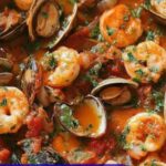 A flavorful and hearty seafood stew combining shrimp, mussels, clams, white fish, and scallops in a savory tomato and herb broth, simmered to perfection and served with crusty bread for dipping.