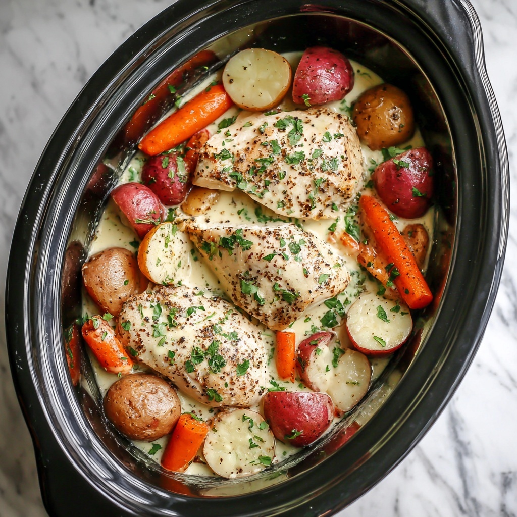 A comforting and creamy slow cooker chicken and potatoes recipe that combines tender chicken breasts with baby potatoes in a rich, garlicky cream sauce. Perfect for a hands-off meal that yields hearty and satisfying flavors with minimal effort.
