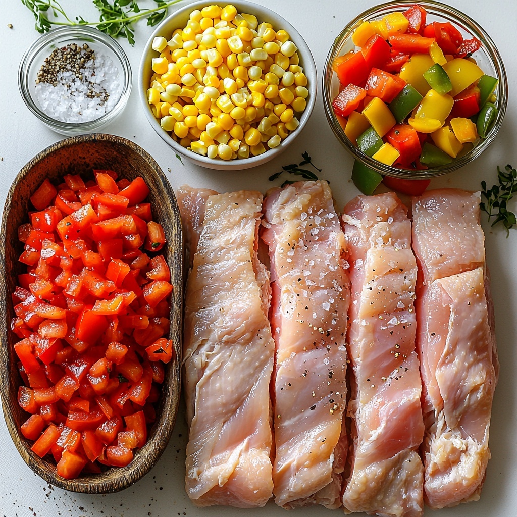 - Add vegetables: Pour the can of diced tomatoes, diced onions, chopped bell peppers, and corn directly over the chicken fillets.