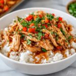 This Slow Cooker Shredded Chicken Rice Bowls recipe offers a simple and flavorful meal perfect for easy weeknight dinners. Tender chicken breasts are slow-cooked with aromatic spices and chicken broth, then shredded and served over fluffy rice with fresh diced vegetables and cilantro for a wholesome, satisfying bowl.
