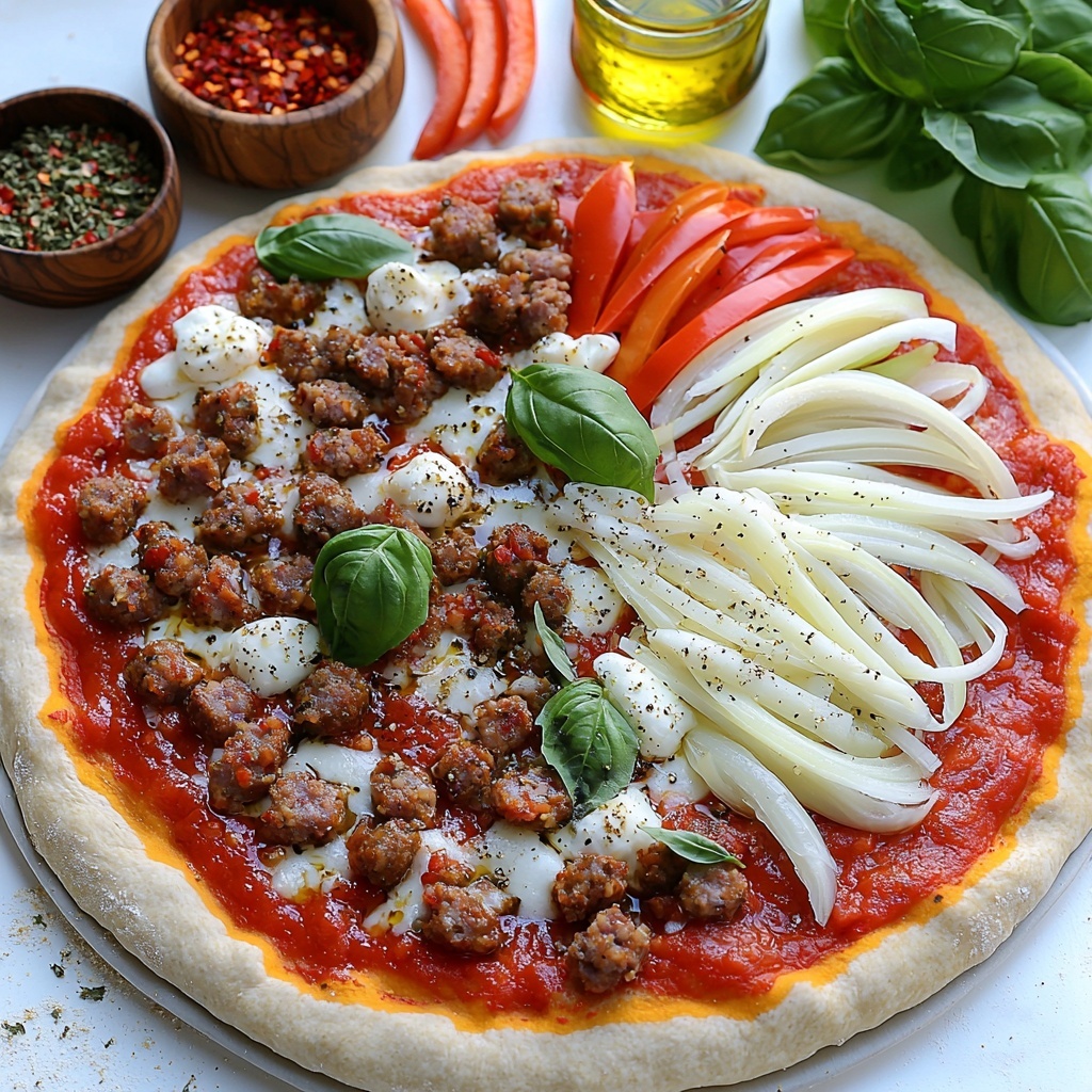 This Spicy Sausage & Pepper Pizza recipe combines the bold flavors of spicy Italian sausage, vibrant bell peppers, and melted mozzarella cheese on a crispy crust. Quick to prepare and bake, it’s perfect for a flavorful homemade pizza night that will impress family and friends.