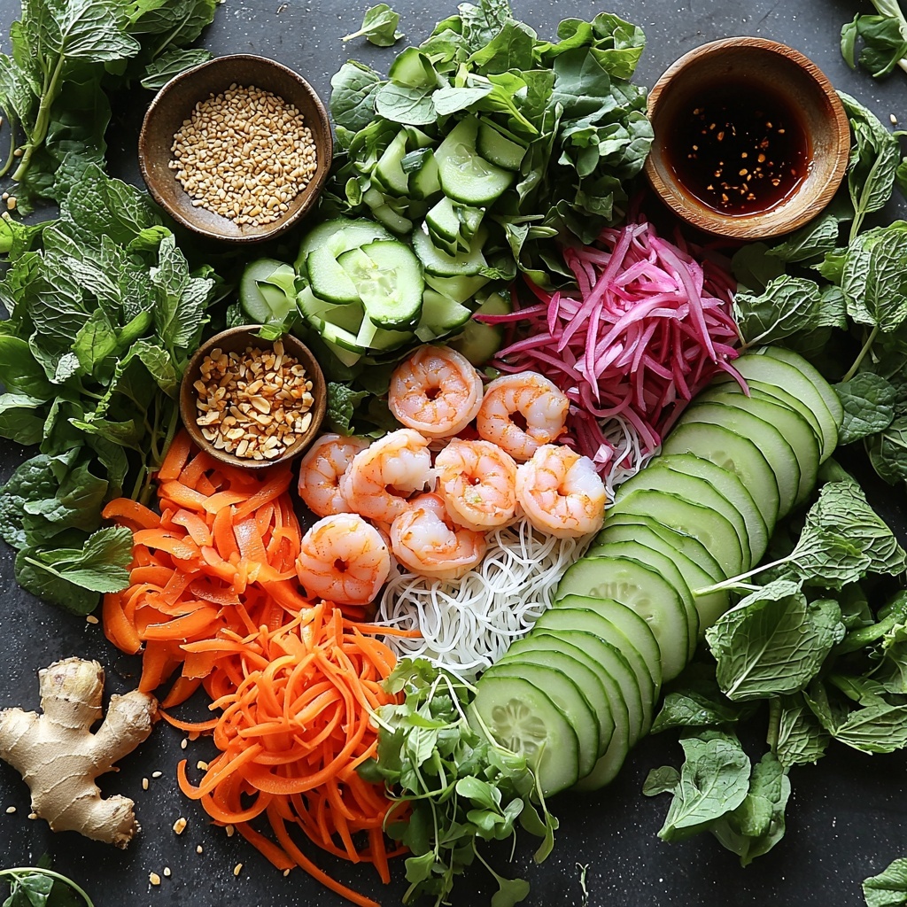 This vibrant Spring Roll Salad with Spicy Ginger Dressing combines fresh mixed greens, crisp vegetables, aromatic herbs, tender cooked shrimp, and delicate rice noodles. Tossed in a zesty, homemade ginger-based dressing with a hint of heat from sriracha, this salad offers a refreshing and healthy dish perfect for a light lunch or appetizer.