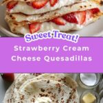 - Assemble the quesadillas: Spread an even layer of the cream cheese mixture over half of each flour tortilla. Then spoon the sugared strawberries evenly over the cream cheese layer. Fold the tortillas in half to form a half-moon shape, securing the filling inside.