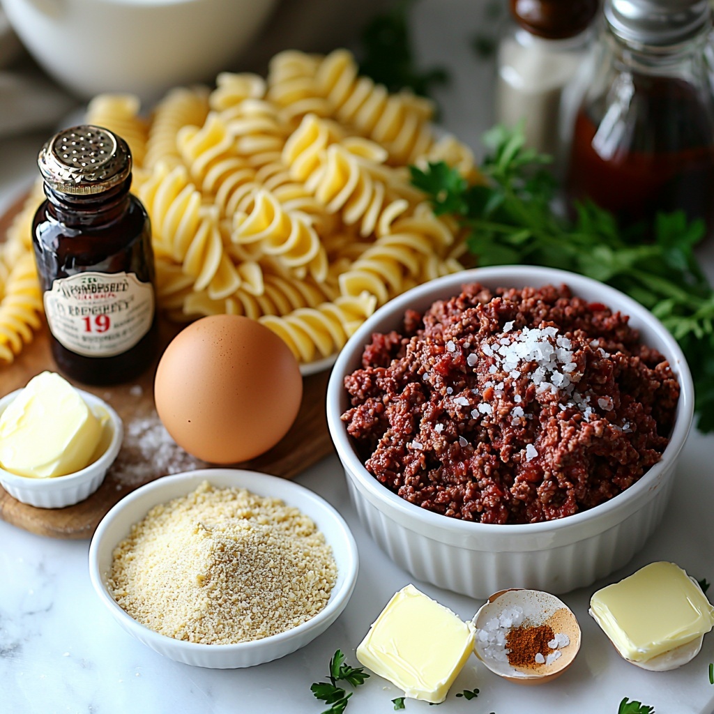 Start by preheating your oven to 400°F and lining a baking sheet with parchment paper. In a large bowl, combine the ground beef, breadcrumbs, egg, grated onion, garlic, nutmeg, allspice, salt, and black pepper. Mix everything just until incorporated—overmixing can make the meatballs tough. Next, form the mixture into 1-inch meatballs and arrange them evenly on the baking sheet. Bake these little flavor bombs for 18 to 20 minutes until they’re nicely browned and cooked through, which sets the foundation for your pasta bake.