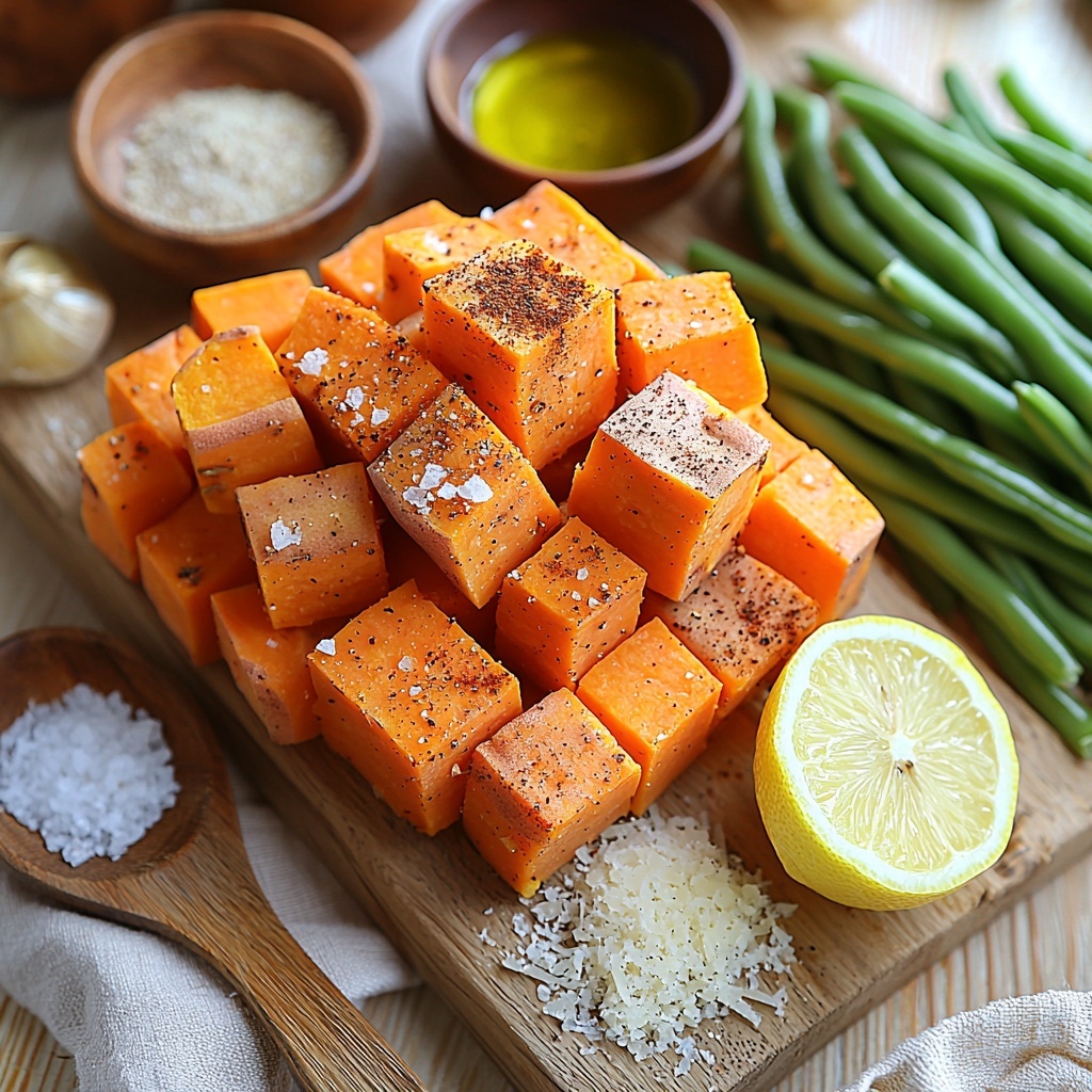 Start by heating your oven to 425°F (220°C). This high temperature is key—it allows the sweet potatoes to develop that beautiful caramelized exterior while the green beans roast to a tender crispness.