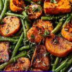 - Roast Vegetables: Place the baking sheet in the preheated oven and roast for 25-30 minutes, stirring halfway through the cooking time. Roast until sweet potatoes are tender and slightly caramelized and green beans are cooked but still crisp.
