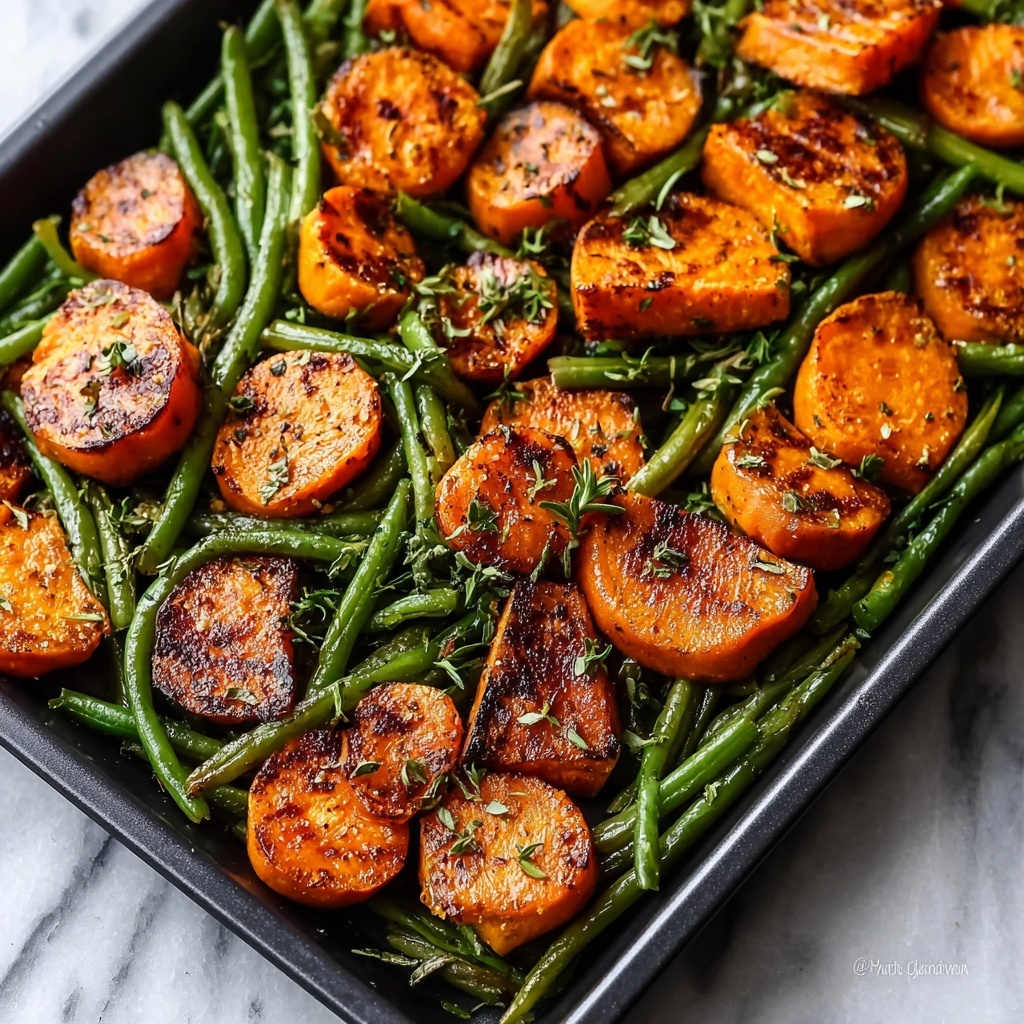 - Roast Vegetables: Place the baking sheet in the preheated oven and roast for 25-30 minutes, stirring halfway through the cooking time. Roast until sweet potatoes are tender and slightly caramelized and green beans are cooked but still crisp.