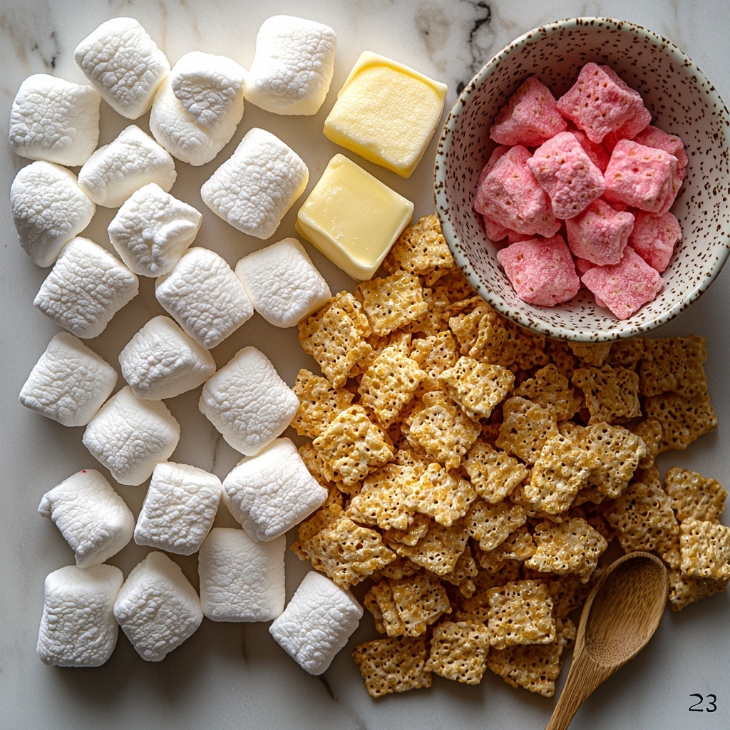 This recipe keeps things wonderfully simple with just a handful of ingredients that each play an essential role. From buttery richness to that signature marshmallow goo, and the pop of strawberry flavor and color, here’s what you’ll want to gather before you start mixing up these irresistible treats.