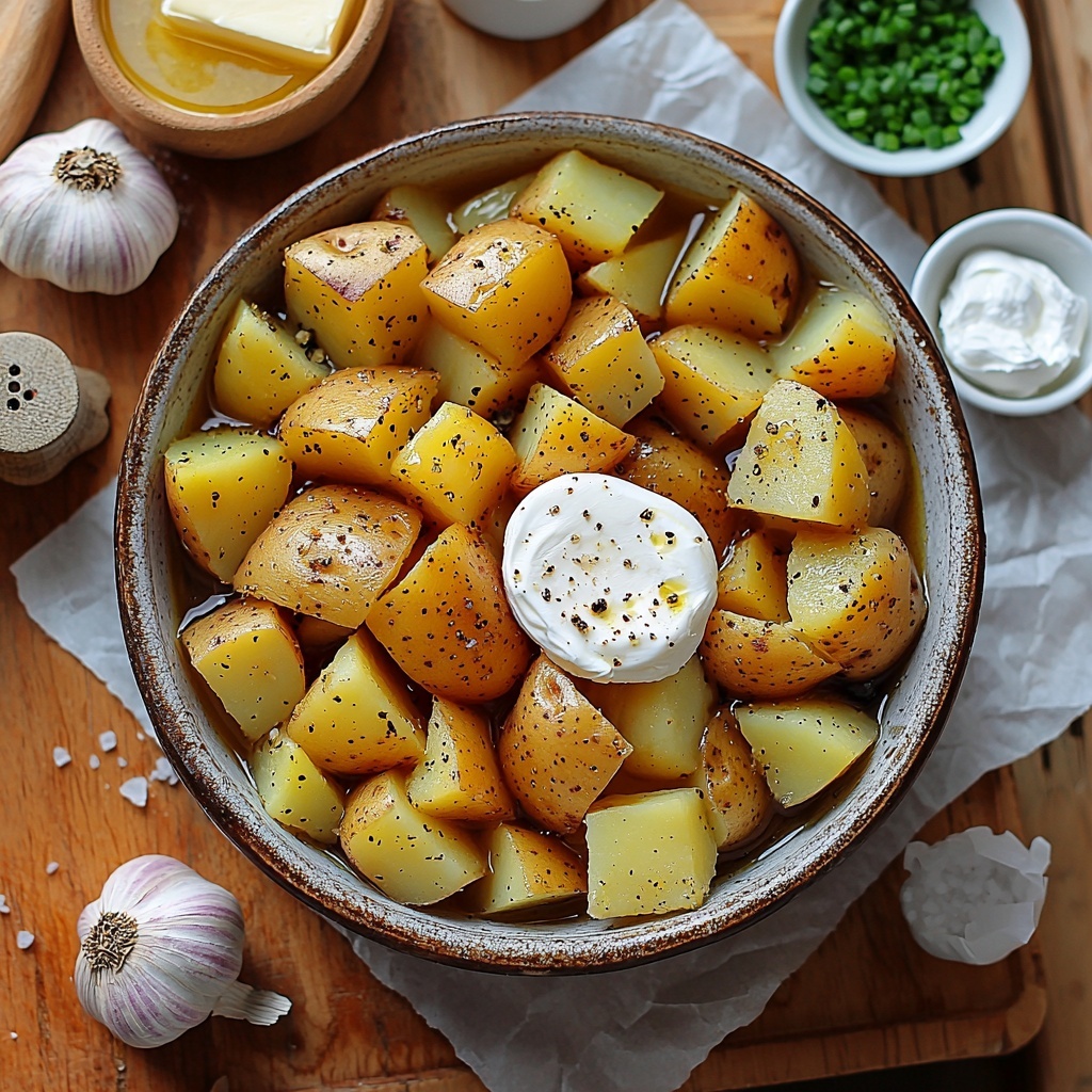 - Prepare Potatoes: Peel and cube the Yukon Gold potatoes into even-sized chunks to ensure they cook evenly. Place the cubed potatoes into a 6-quart crockpot along with minced garlic, salt, and black pepper.