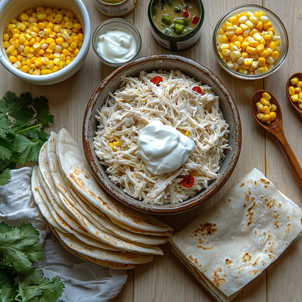 - Prepare Filling Mixture: In a separate bowl, combine the shredded chicken, corn kernels if using, half of the shredded cheese, and one-third of the prepared sauce. Stir everything together evenly.