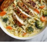 Reheat gently on the stovetop over medium-low heat, stirring frequently to prevent the noodles from sticking or breaking apart. If the soup thickens too much, add a splash of chicken broth or cream to bring it back to your desired consistency.