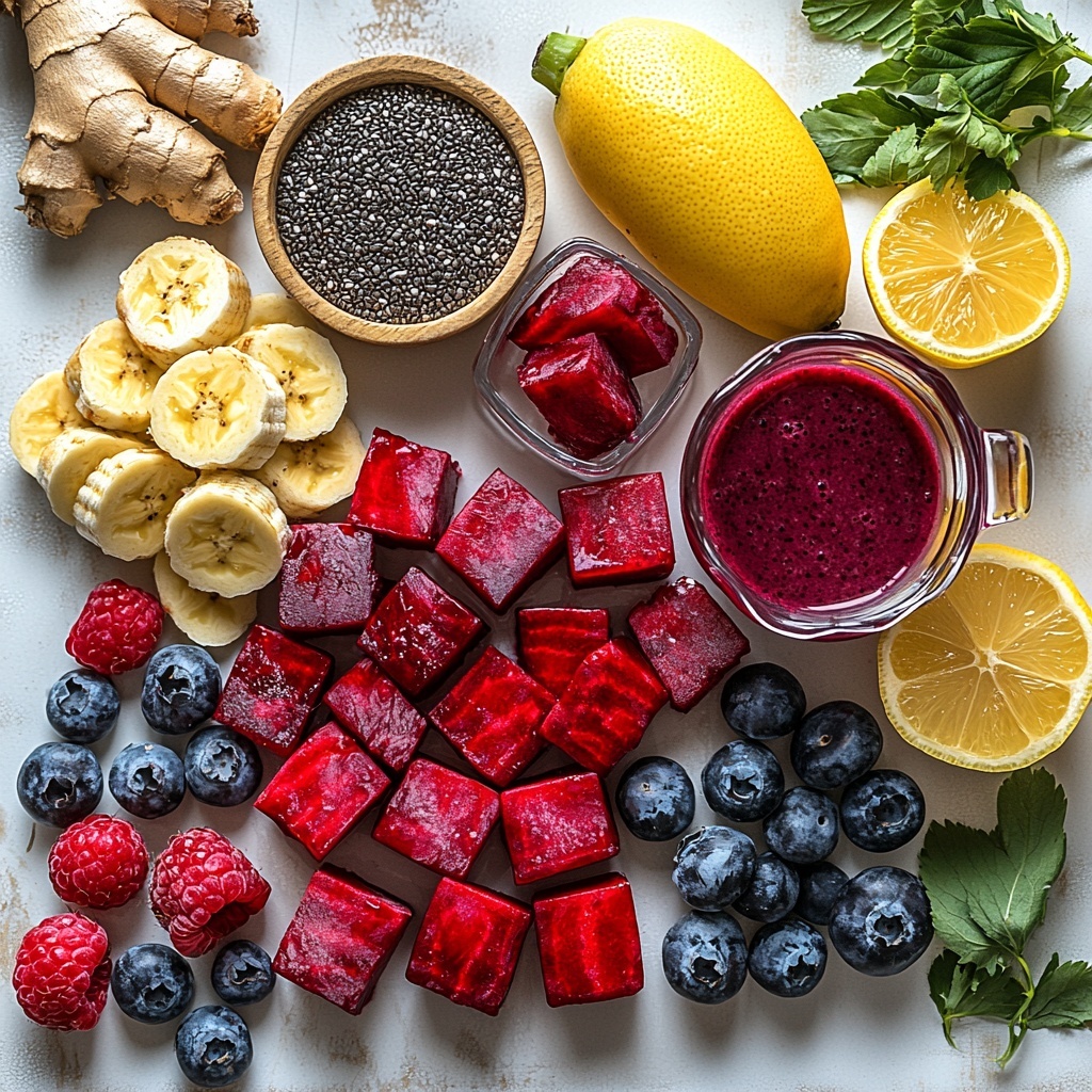 Start by peeling and chopping your cooked beet into small pieces so your blender handles it easily. Having frozen mixed berries ready means your smoothie will be perfectly chilled without watering down. Measure and prep the banana, almond milk, chia seeds or flaxseed, fresh grated ginger, and lemon juice so everything is at the ready.